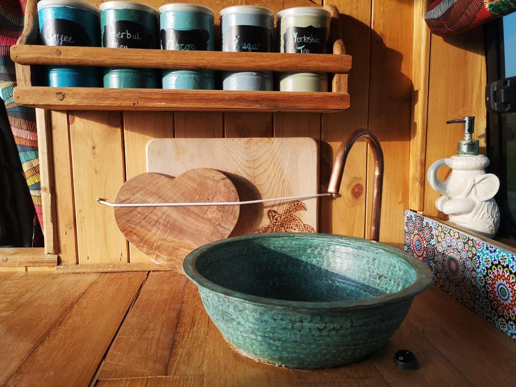 James has built a beautiful rustic kitchen using recycled whisky barrel wood, which is set off really well by the copper verdigris sink sourced from Egypt. She wanted a simple copper pipe tap, so we bent one to shape….it compliments the sink beautifully.