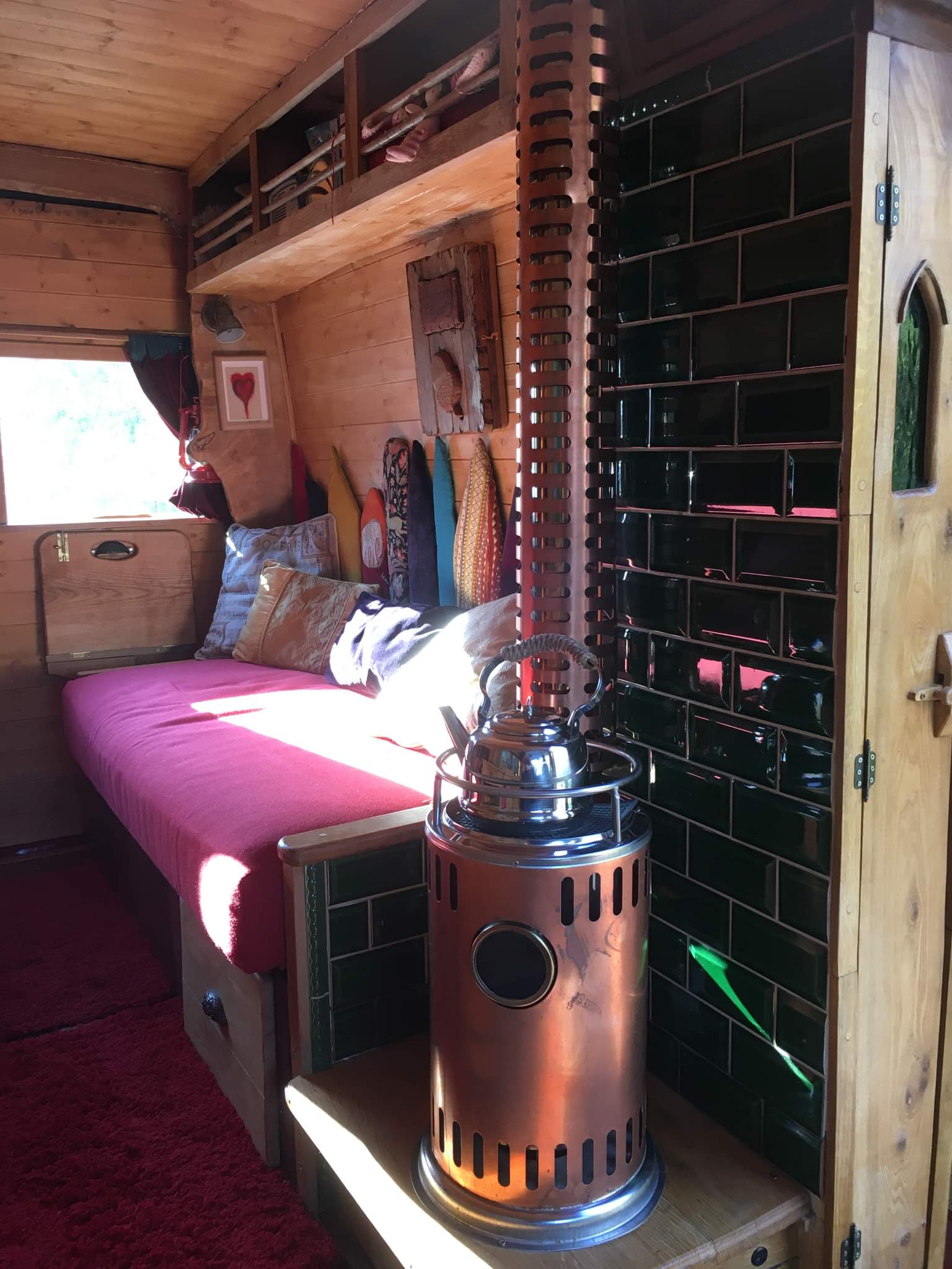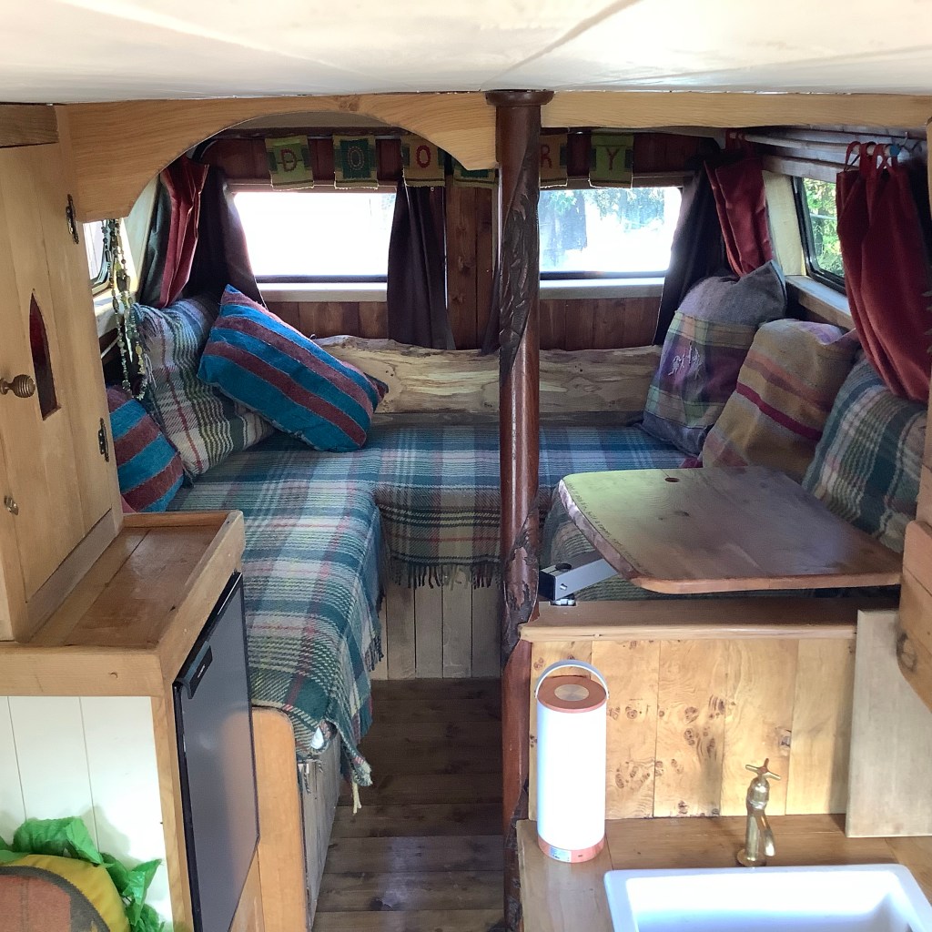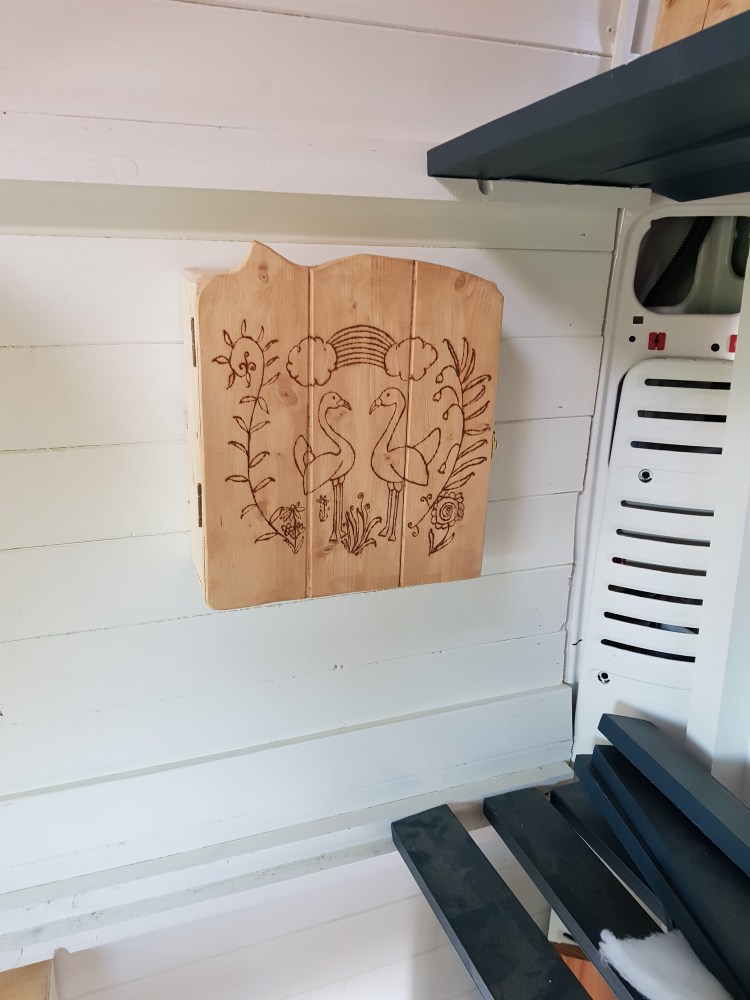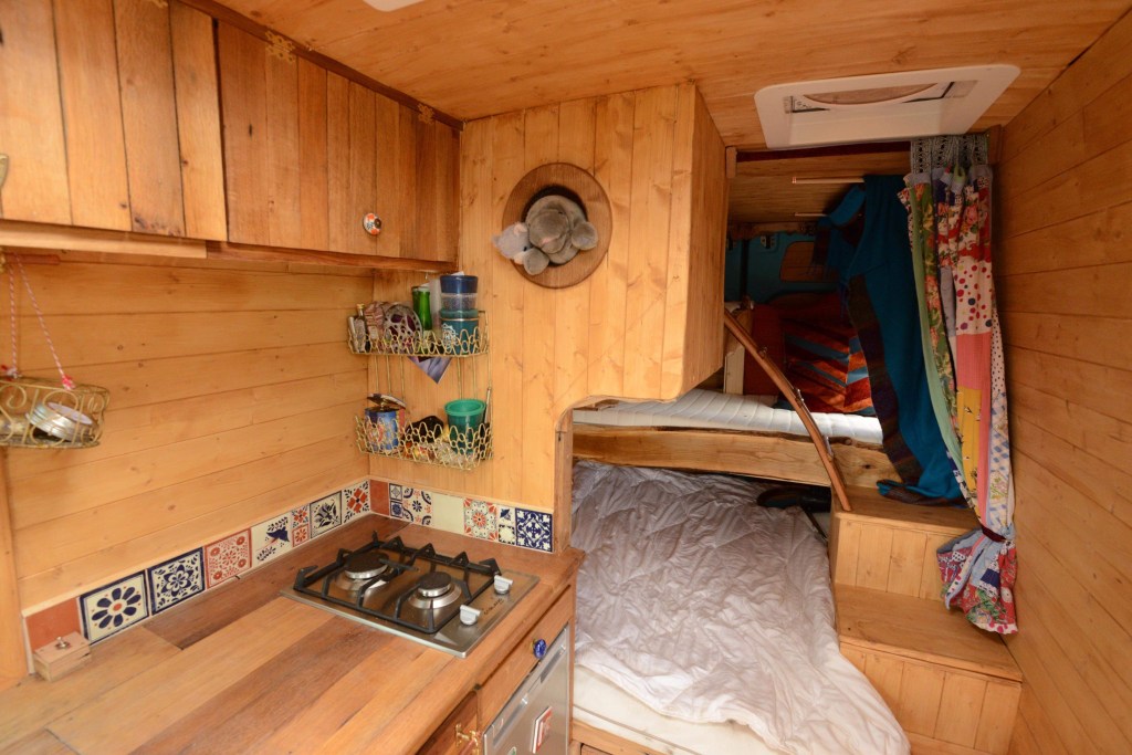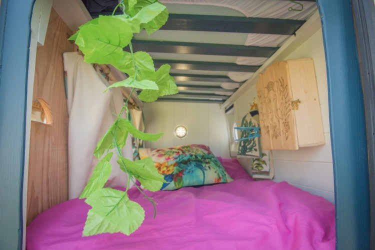 We built top cupboards and shelving into the sleeping area. And incorporated some of Laura’s collection of recycled coffee sacks into the space.