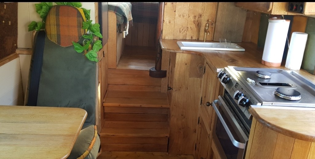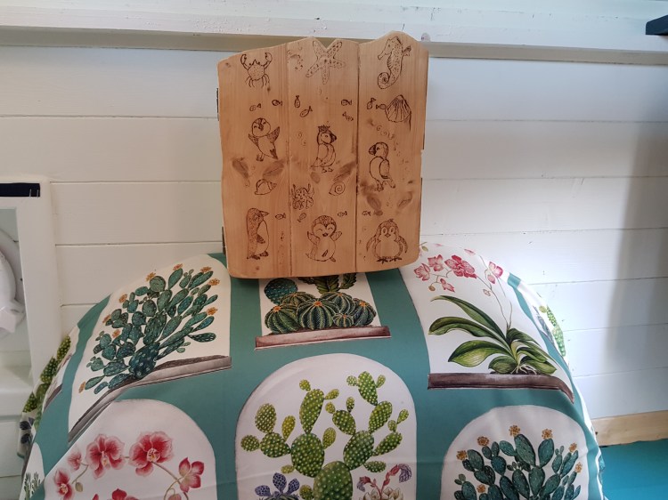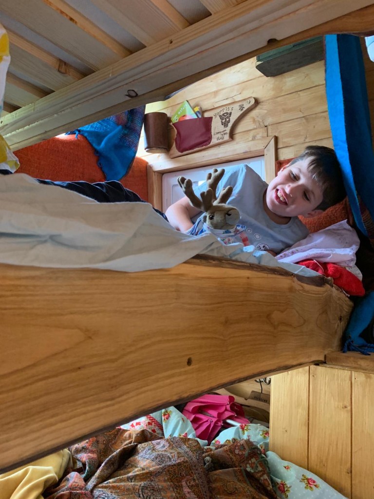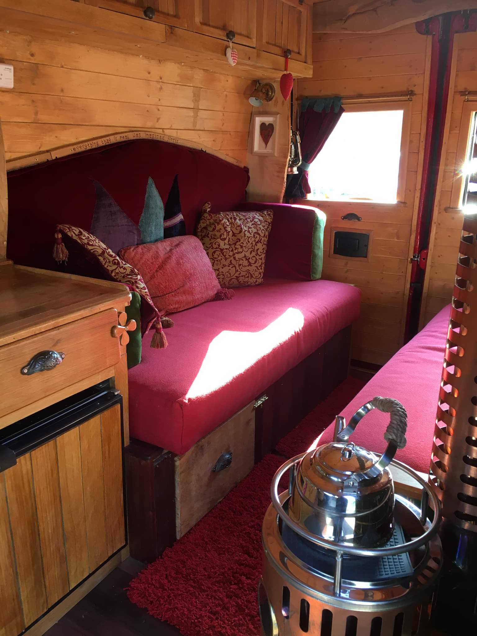 We built top cupboards and shelving into the sleeping area. And incorporated some of Laura’s collection of recycled coffee sacks into the space.